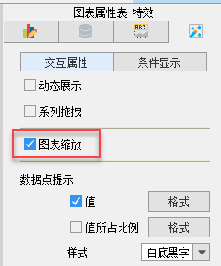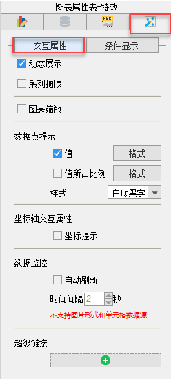 为了更直观地查看图表数据,希望鼠标移动到图表的某值时,会提示相应的数据信息或者希望图表可以实时刷新。此效果,可通过选中图表,点击图表属性表-特效>交互属性进行设置,下面介绍交互设置的各种使用方法及效果。
