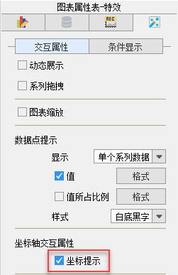 选中图表,点击图表属性表-特效>交互属性,勾选坐标轴交互属性中的坐标提示,如下: