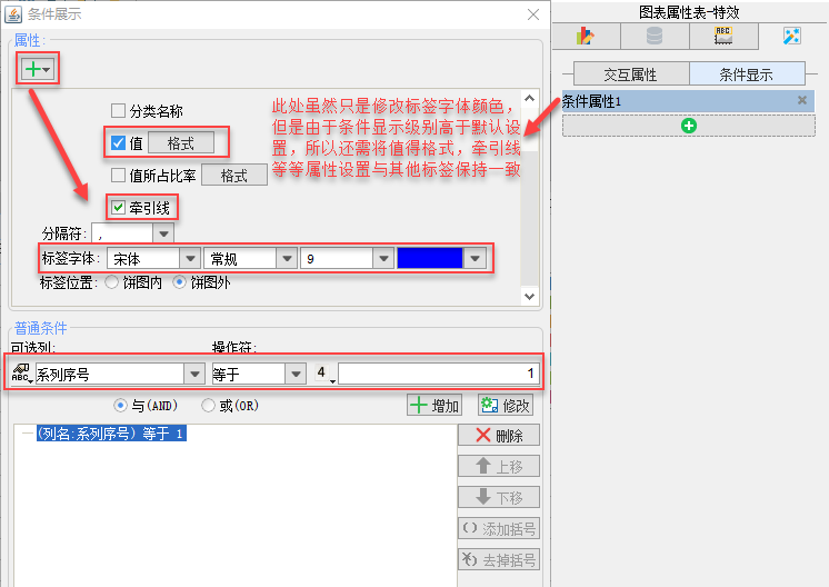 ,添加条件属性1,属性选择 ,修改 的样式,这里将字体颜色修改为蓝色,然后在普通条件处增加