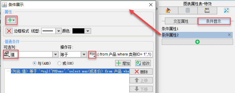对最大成本系列设置类似,添加条件属性2,点击选择要改变的属性,条件为值 等于 '=sql("FRDemo","select max(成本价) from 产品 where 类别ID= 1",1)',如下图: