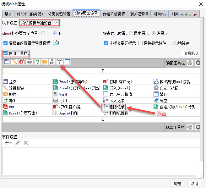 打开设计器,新建一张模板,点击模板>模板web属性>填报页面设置,选择,勾选,双击工具栏框里面的,就会在顶部工具栏出现删除记录按钮,如下图: