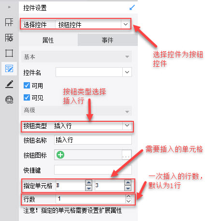 右击该单元格,点击控件设置,右侧属性面板自动切换至控件设置,控件选择按钮控件,按钮类型选择插入行,指定需要插入的单元格和一次想插入的行数,如下图所示: