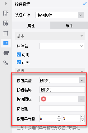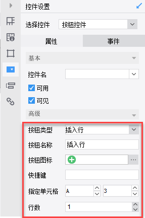 在G3和H3单元格增加按钮控件,G3按钮类型选择插入行,指定单元格选择A3,并且设置插入行的行数为1行即点击增加行时只增加一行。如下图所示: