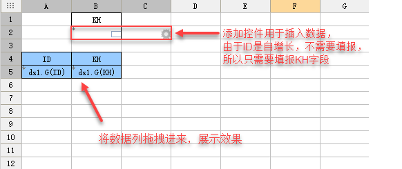 注:由于ID自增长不需要自己输入,因此只需要填报KH字段,B2单元格需要设置为纵向扩展,第二行的两个控件分别是,文本控件和按钮控件,按钮控件是插入行控件。