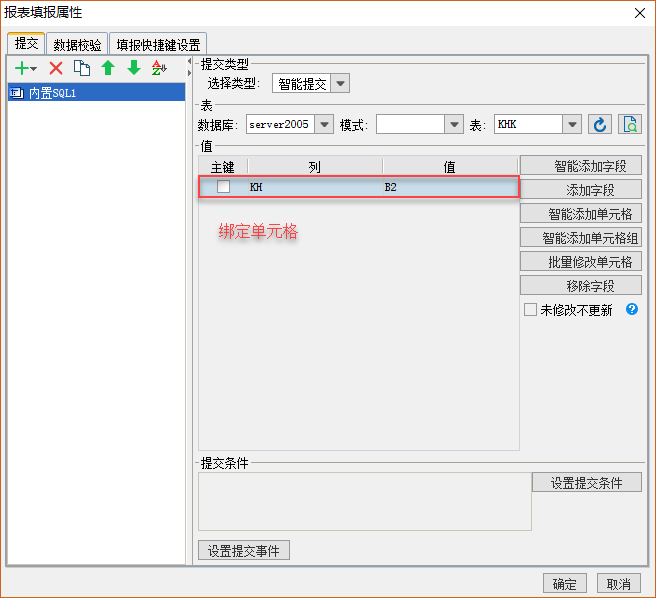 注:由于ID自增长不需要自己输入,因此只需要填报KH字段,B2单元格需要设置为纵向扩展,第二行的两个控件分别是,文本控件和按钮控件,按钮控件是插入行控件。3)填报属性设置