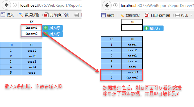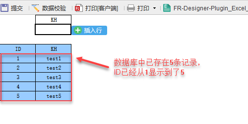 在KH标题下面的控件中插入2条数据,点击提交按钮,将数据提交入库,刷新页面,可以看到下面蓝色区域部分多了2条数据,即刚刚填报数据的数据,并且ID列也进行了自增长。