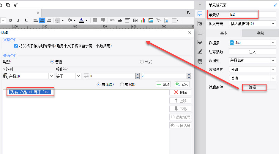 数据列来源于2个数据集,需要在单元格中设置过滤条件,选中E2单元格,在右侧属性面板中选择单元格元素中的选择过滤,条件设置为产品id等于单元格D2,如下图: