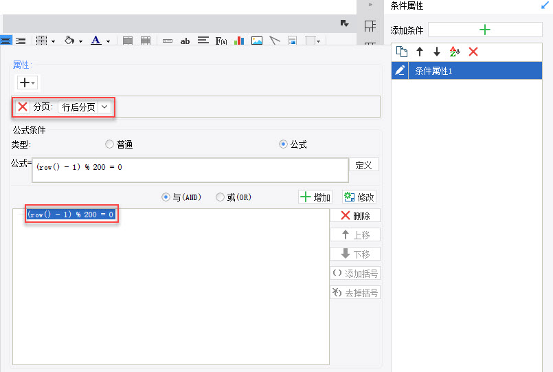 形如分页预览中的每页显示固定行数,填报分页也如此设置,如下图,选中C2单元格右击条件属性,属性面板自动切换至条件属性面板,添加一个条件属性,如下图: