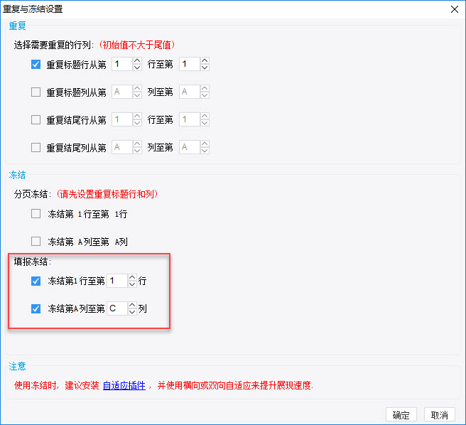 点击菜单栏的模板>重复与冻结设置,在填报冻结栏里面讲第一行以及第三列冻结起来,如下图: