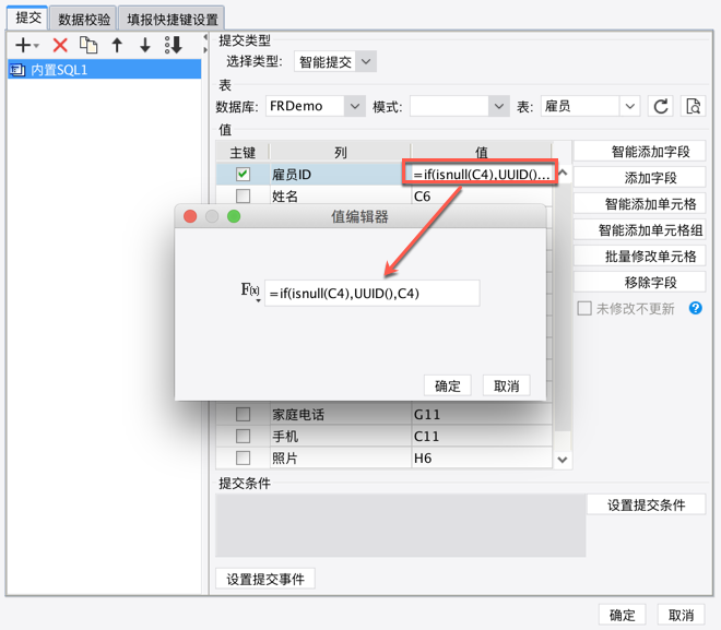或者可以再员工编号单元格中输入公式=UUID(),在报表填报属性中将雇员ID的值绑定为该单元格: