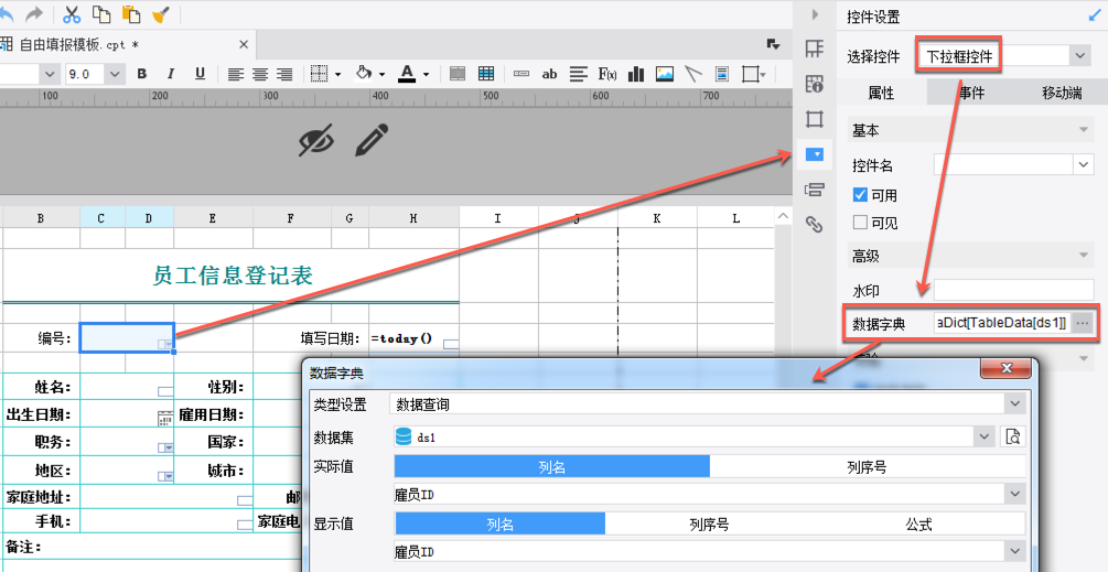 注:if(isnull(C4),UUID(),C4)表示当C4单元格中有值时,就修改该条数据;没有值时,就生成唯一的编号新增一条数据。并将C4单元格控件改为:下拉框控件,并添加数据字典,如下所示: