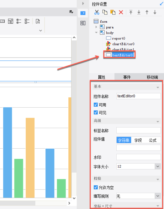 在决策报表中拖入一个文本控件,可以看到其属性设置界面与控件类型的设置一样,这里不再赘述,如下图: