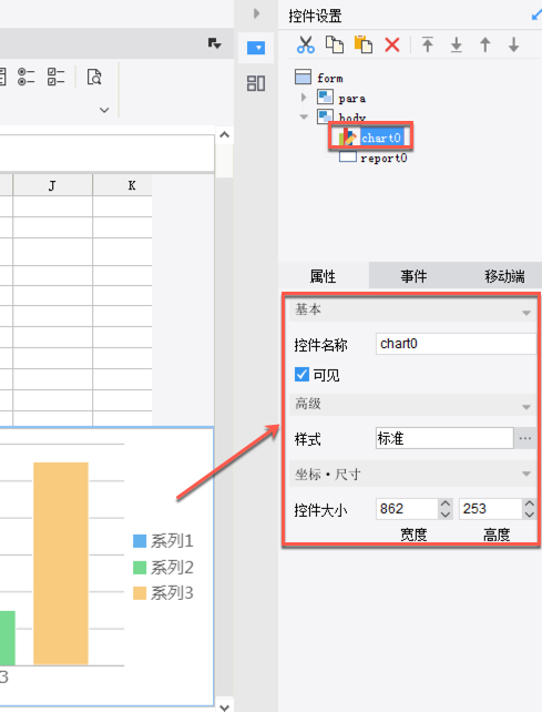 该决策报表中有一个图表组件,我们选中图表组件,即可在右上方的面板中对图表块组件样式进行设置,如下图:
