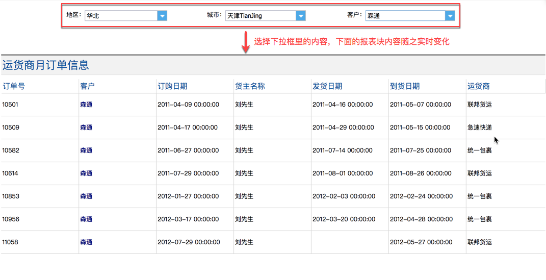 如下图,选择顶部几个下拉框数据的时候,下方报表块中的数据随之实时变化: