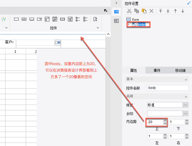 右侧的客户下拉框控件直接靠右边显示,和其他的2个下拉框控件不协调,那么我们是否也可以设置右边距使其不靠右显示呢?不可以的,body的内边距设置时针对整个决策报表的,会作用于该决策报表的所有组件,但是可以往决策报表右侧添加一个空白标签控件,如下图: