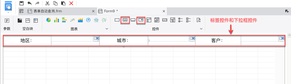 新建一张决策报表,往决策报表中拖曳三个标签控件、三个下拉框控件和一个报表块组件,如下图