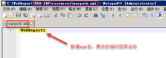 如下图,我们在warpath.xml中输入下面内容,则工程WebReport1部署完成之后,临时目录名称则为WebReport1.