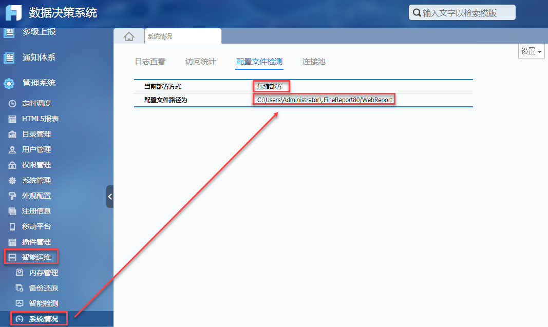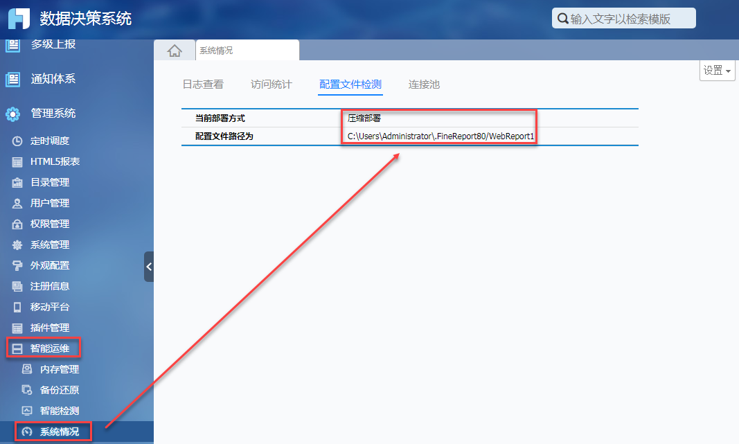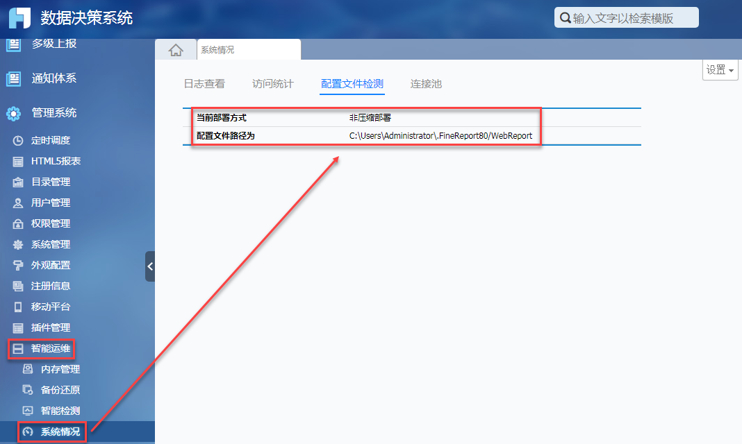 打开管理平台,在管理系统>智能运维->系统情况,配置文件检测下可以查看到war包部署之后的效果,部署方式为压缩部署,配置文件路径即临时目录文件路径为:C:\Users\Administrator\.FineReport80/WebReport,如下: