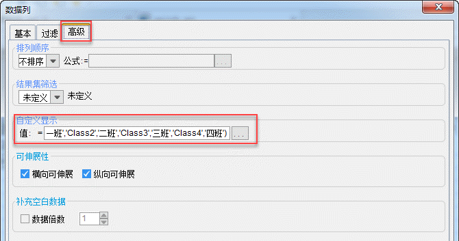 单击A2单元格,右键单元格元素>插入数据列>高级,或者双击单元格,点击,在的值中填入switch($$$,'Class1','一班','Class2','二班','Class3','三班','Class4','四班'),意思是如果当前值是Class1则显示一班,如果是Class2,则显示二班...,如下图所示: