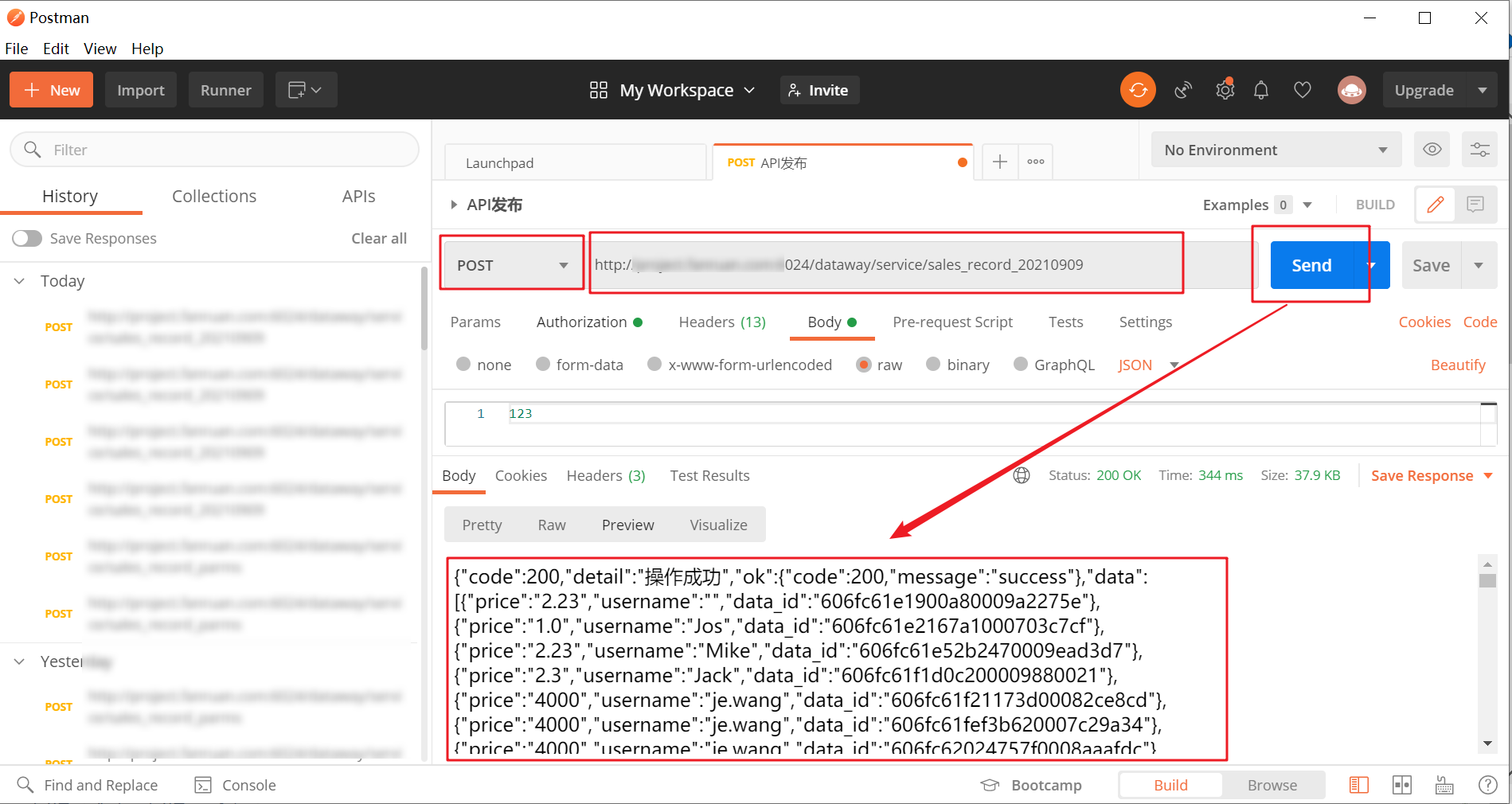打开常用工具postman,新建一个Requet页面,Method选择POST, 输入4.2 中的url链接,由于Body不能为空,在Body配置处任意输入,再进行点击Send,预览如下: