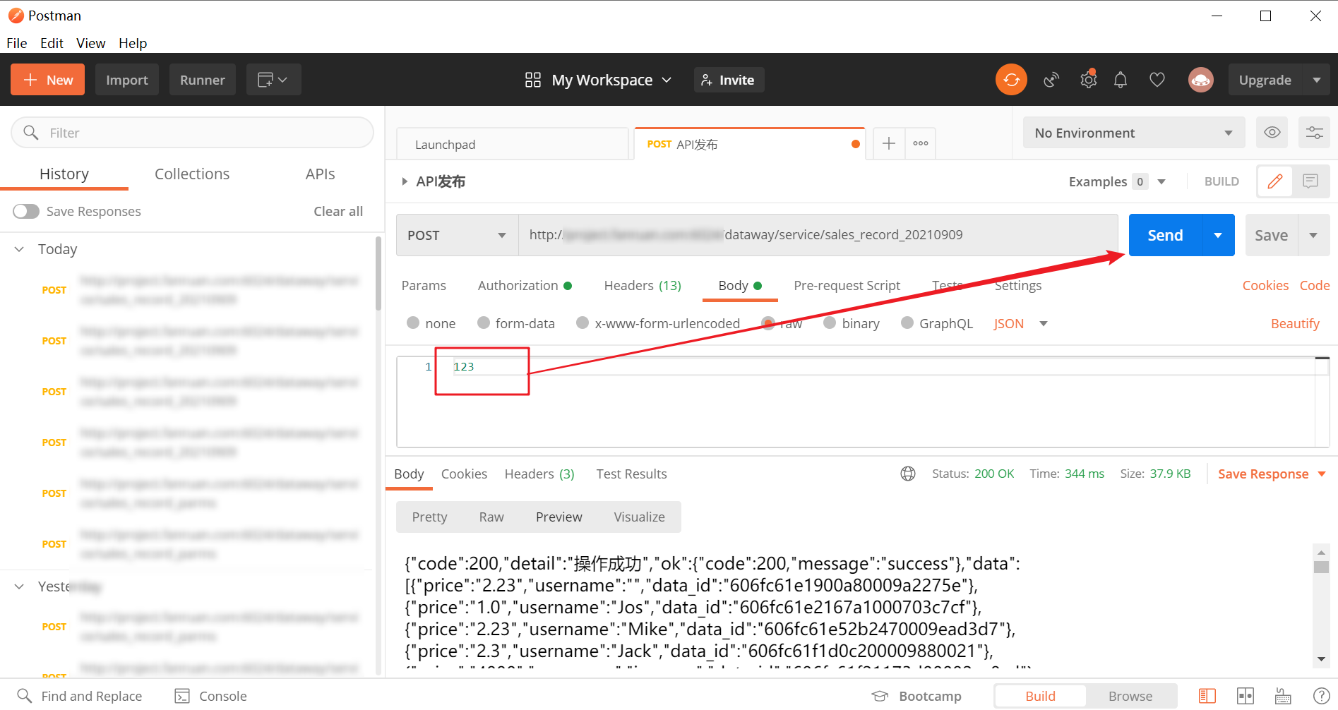 打开常用工具postman,新建一个Requet页面,Method选择POST, 输入4.2 中的url链接,由于Body不能为空,在Body配置处任意输入,再进行点击Send,预览如下: