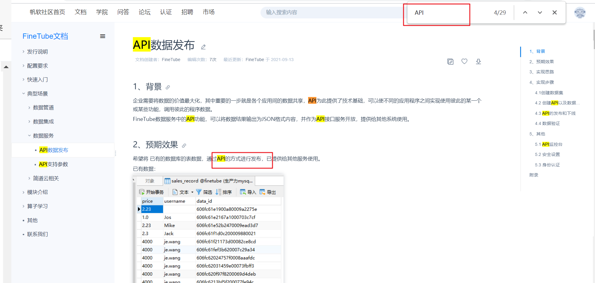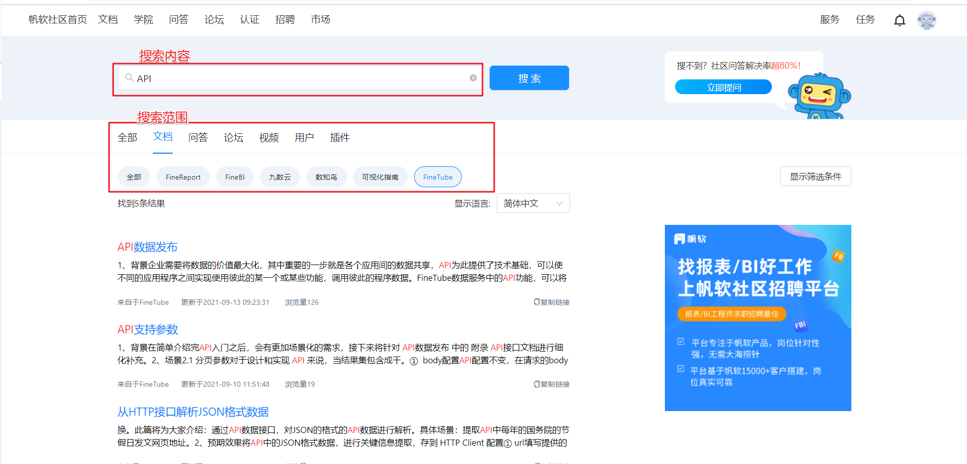 在 FineTube 的帮助文档下搜索,会根据输入的内容,匹配关键字。出现相似问法,帮助用户搜索。