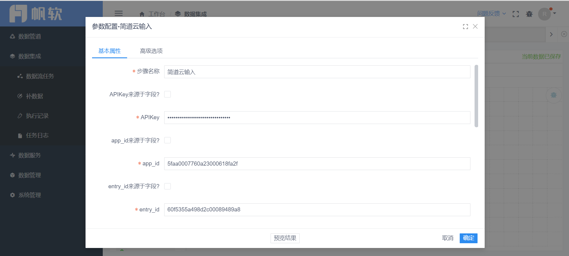 配置APIKey、AppId、EntryId(若不知道这3个参数在简道云的什么地方进行配置,请参考此篇:简道云输入参数配置)