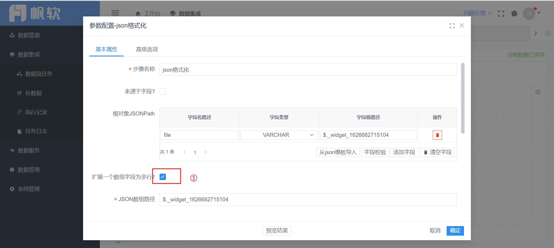 此处以文件作为例子,对简道云输入的数据进行json解析,因为附件和图片字段都是数组形式,此处需要拆分成多行,如①所示。