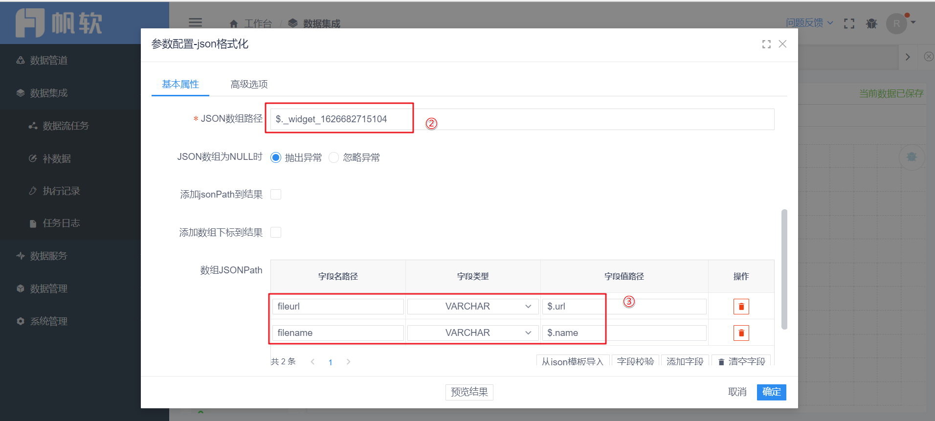 ②配置JSON数组路径,进行JSONPath数组的配置,如③所示。