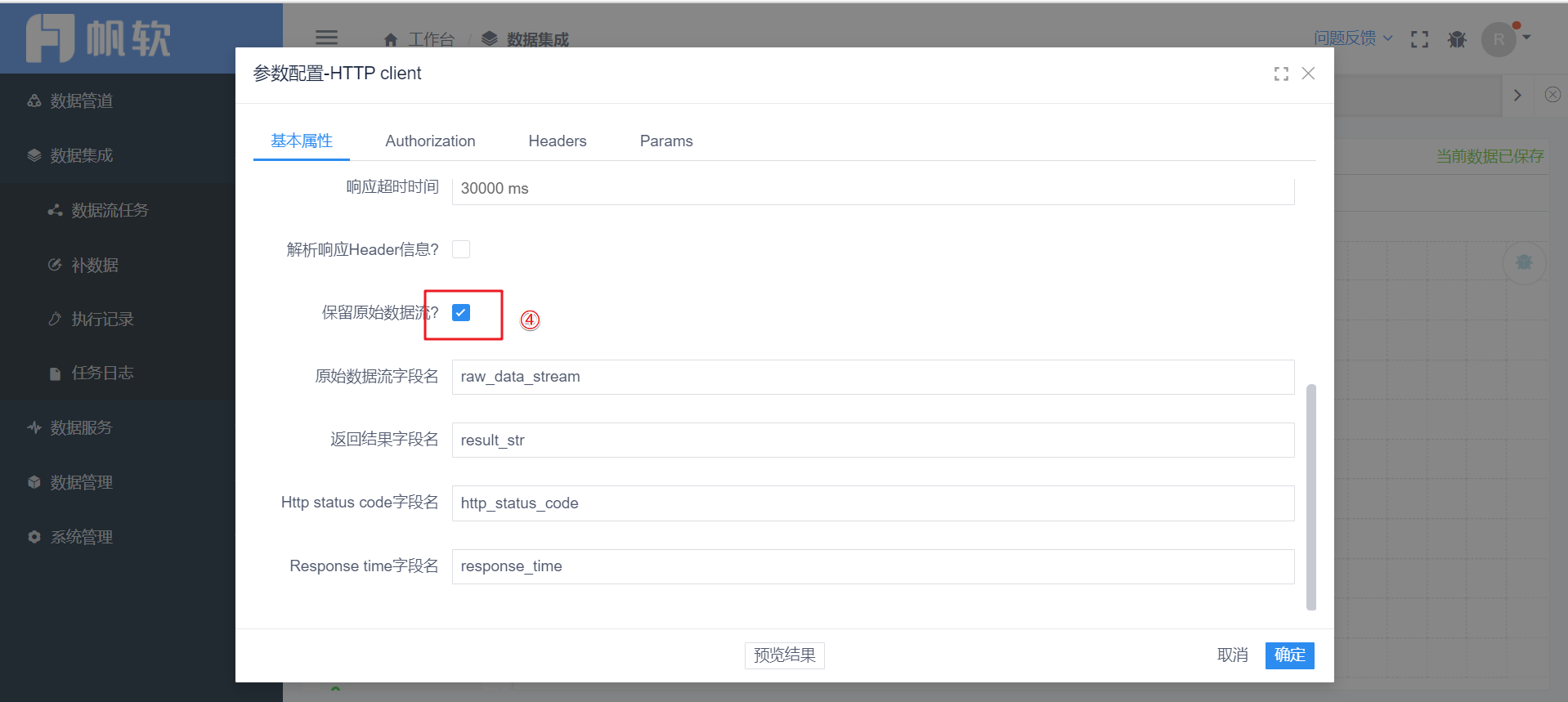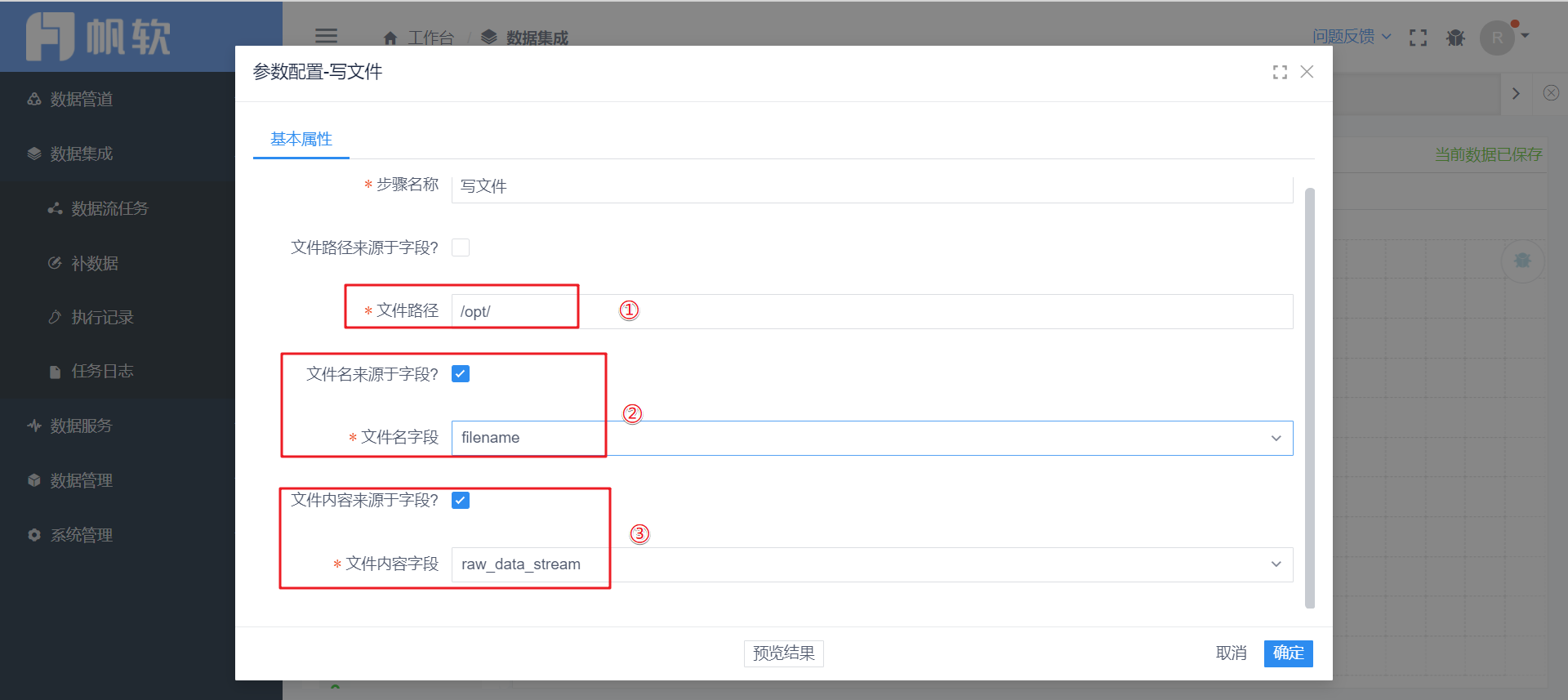 ③ 勾选文件内容来源于字段,则可选择在2.3的第④步中配置的原始数据流字段名