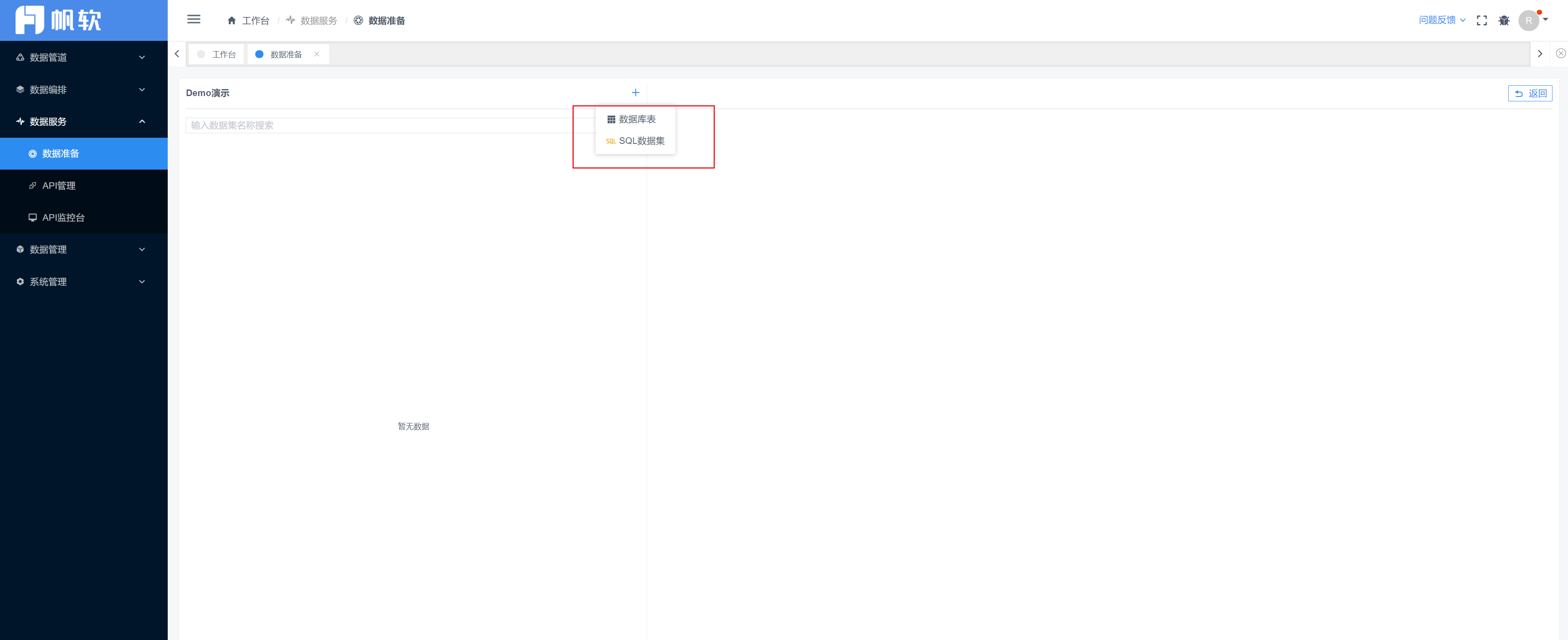 目前数据集提供两种模式进行添加:数据库表、SQL数据集。