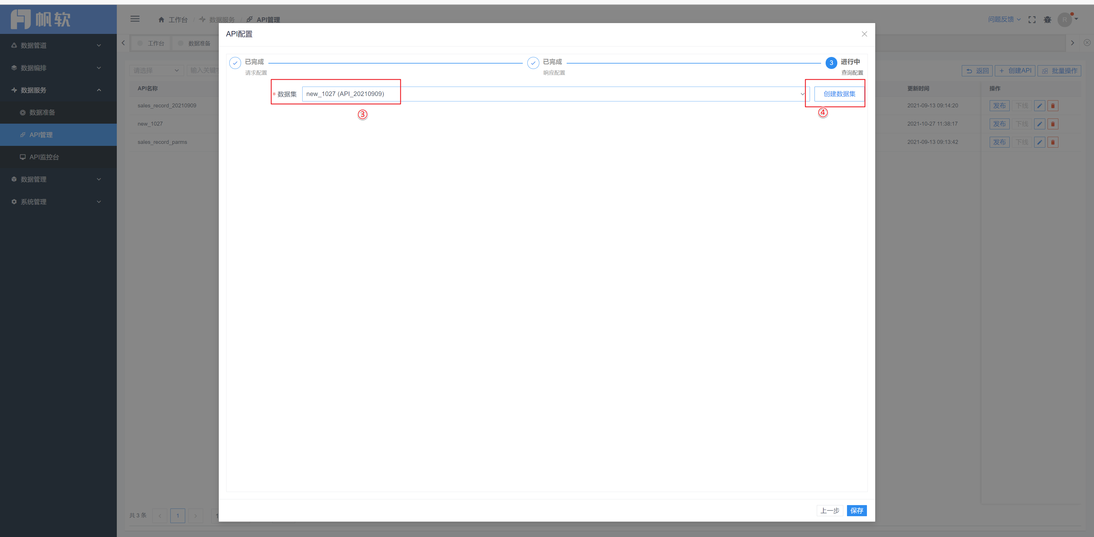 若在4.1 已经完成数据集的创建,则在③可直接进行选择对应业务包下的数据集,若没有需要发布的数据集,则点击④进行新建。