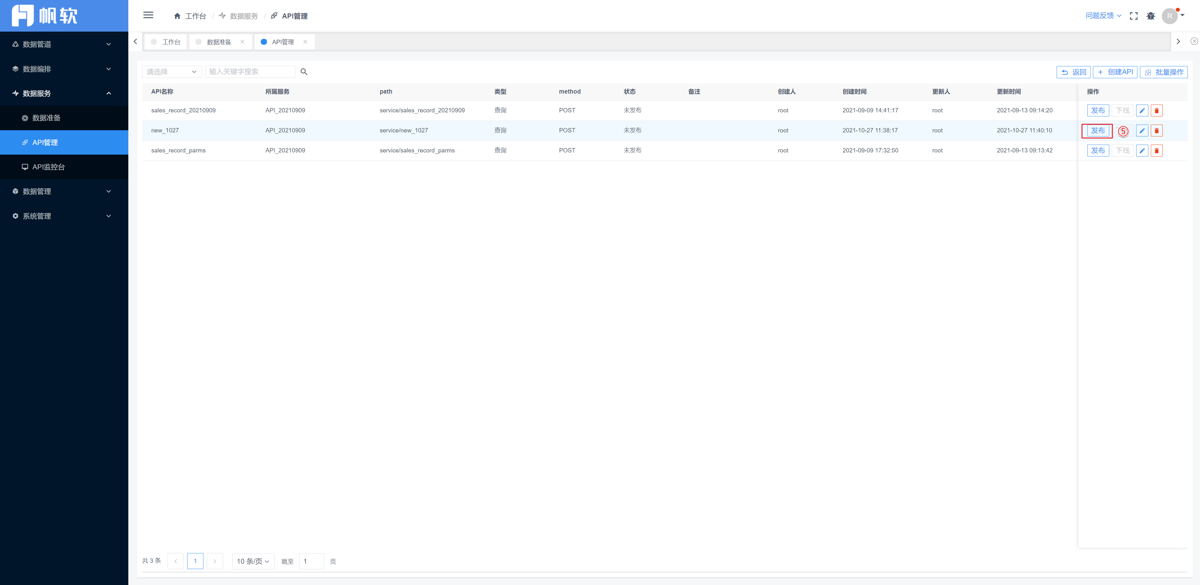 目录:数据服务>>API管理>>创建服务>>创建API>>发布数据