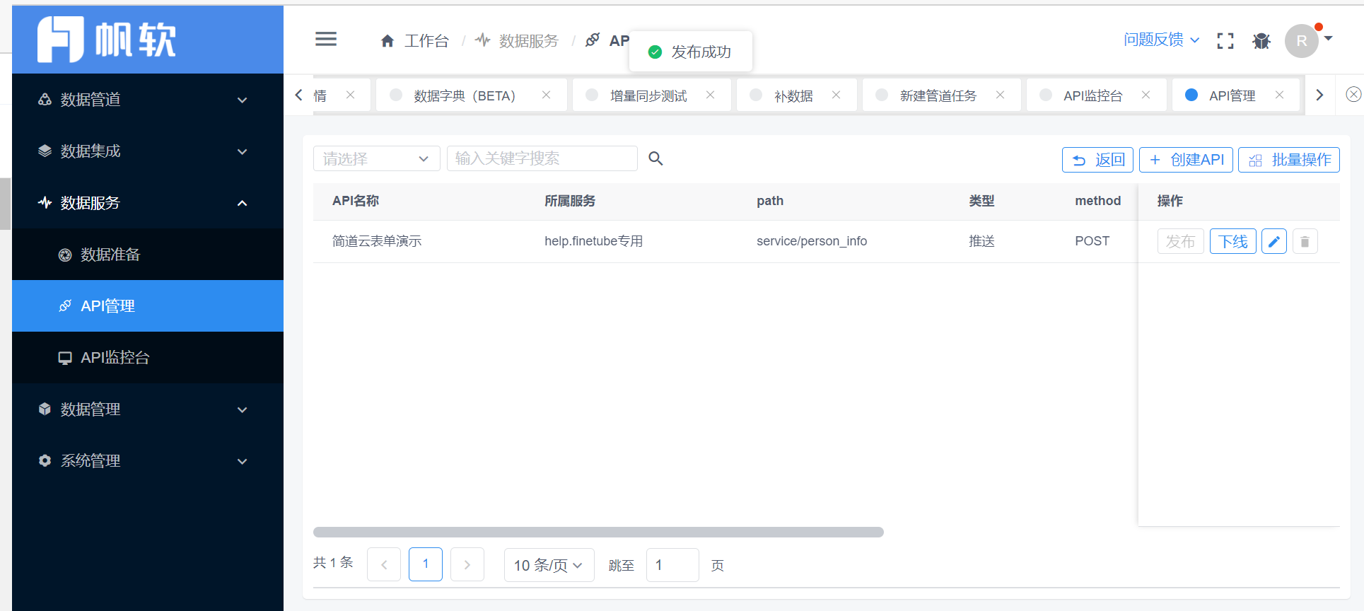 创建API服务 用来接收数据,并进行发布,具体操作请参考:创建API接收数据。