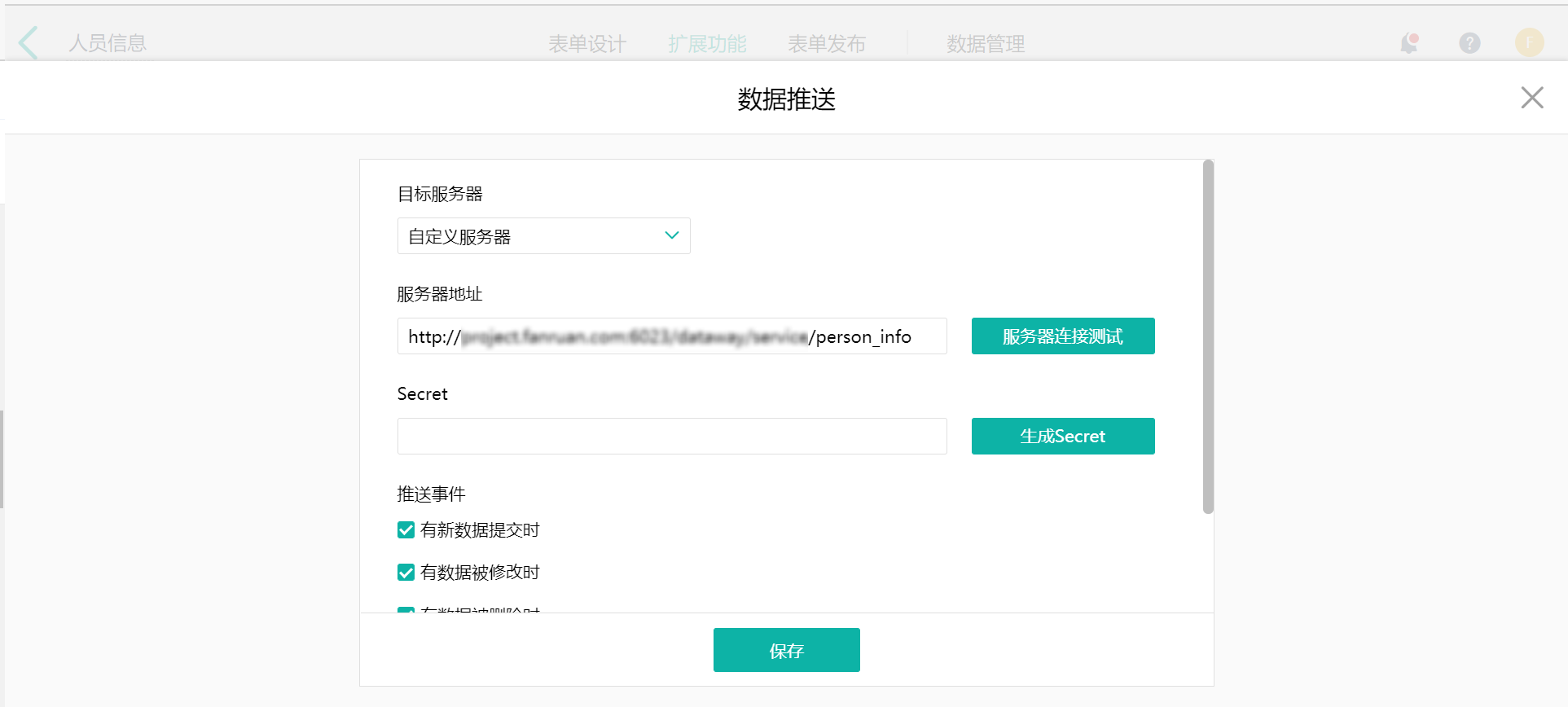 选择上方菜单栏的扩展功能,后选择数据推送,新建数据推送,将2过程中的Path完整的URL填写到对应的服务器地址栏,无需填写Secret,并测试通过,此时则完成了简道云数据推送配置。