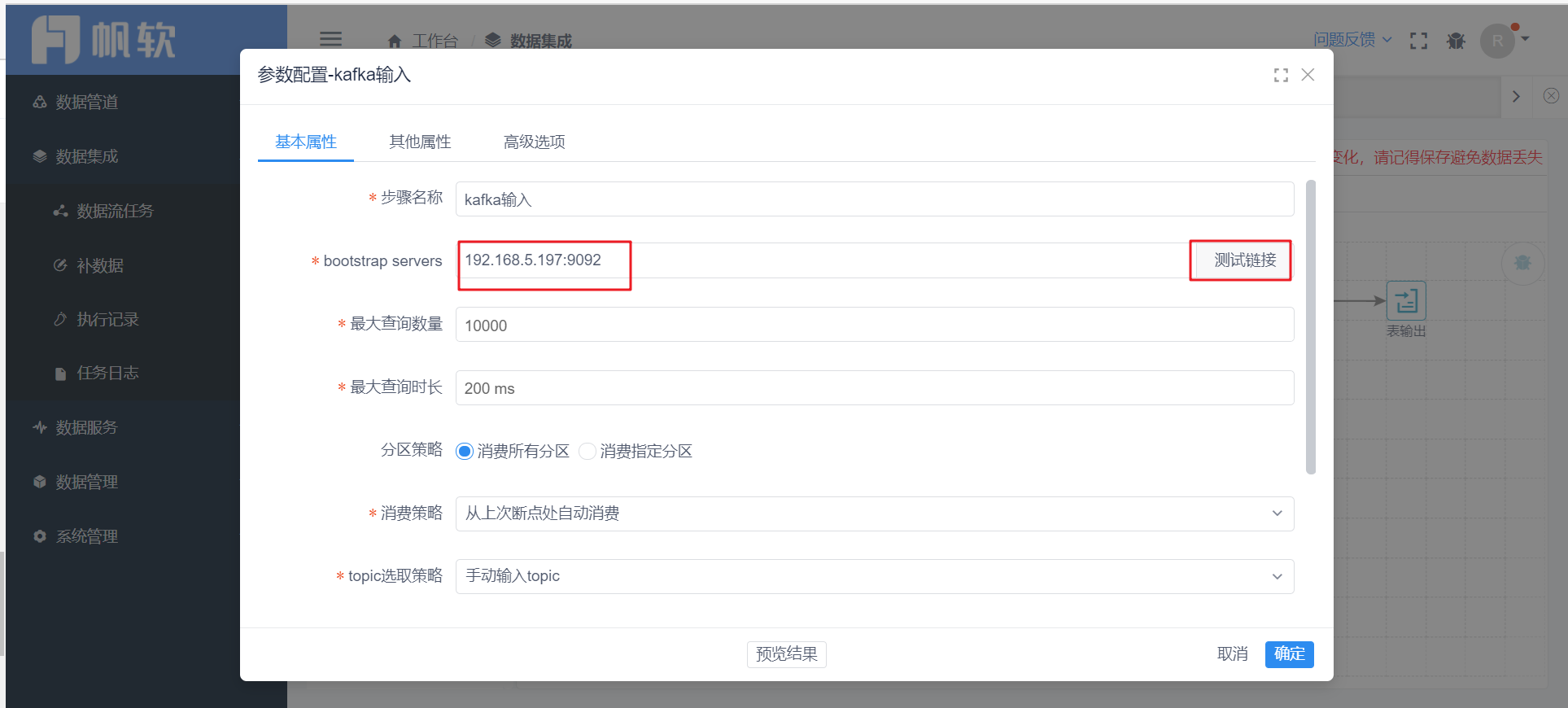 bootstrap servers:填写kafka的对应IP和端口,例如"192.168.XX.XX:9092", 与之前配置API时的kafka一致即可,填写完成后可进行测试。