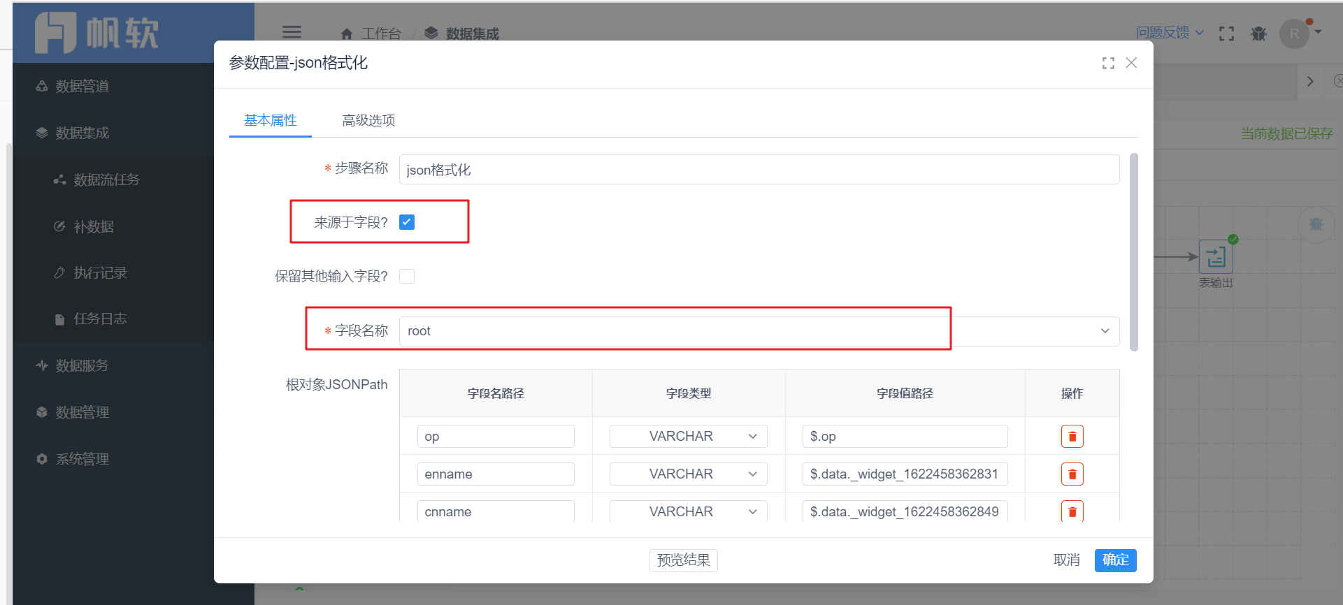 选择【来源于字段?】,字段名称为root(已在4.1中进行配置)