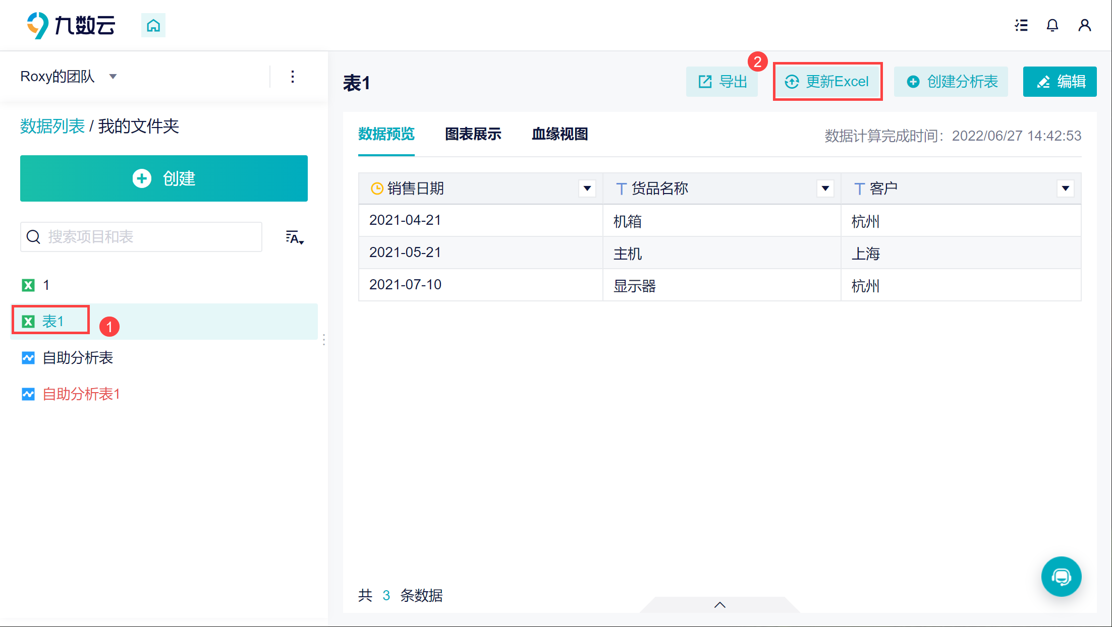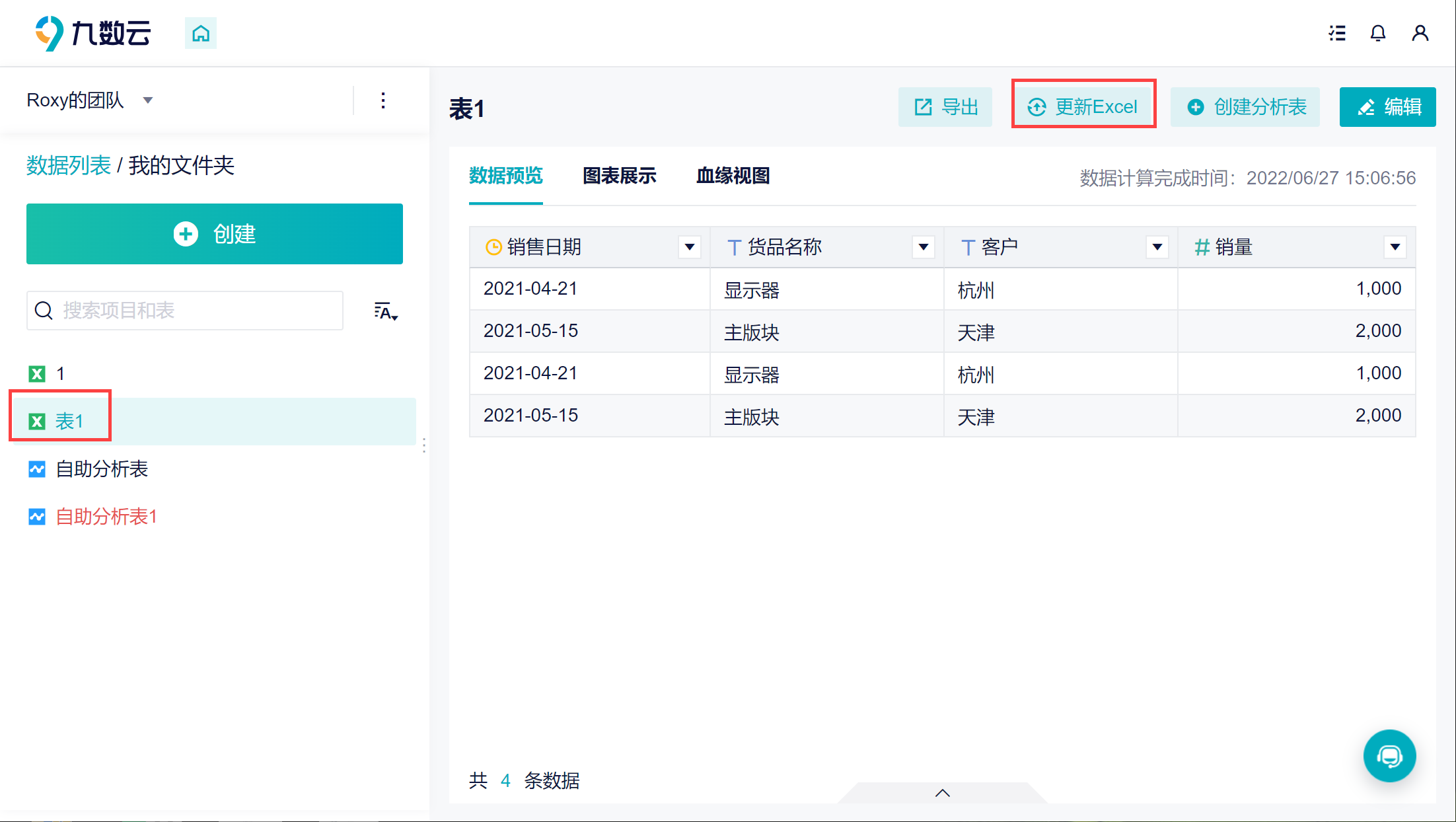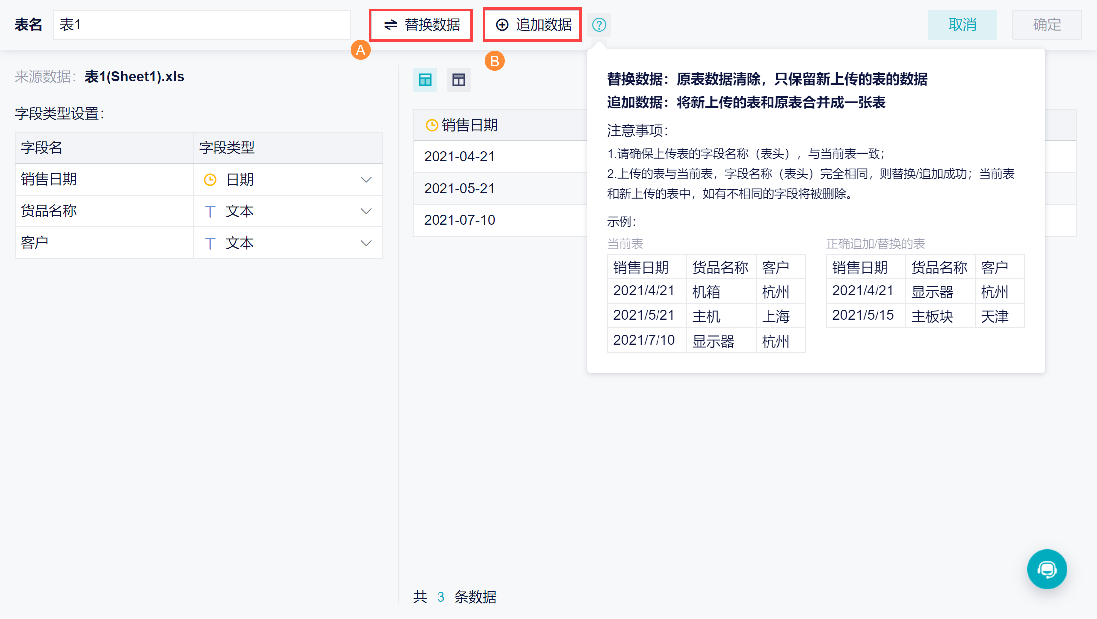 如果需要更新原有的 Excel 表,九数云提供数据表替换、追加的功能,满足用户的多种需求。