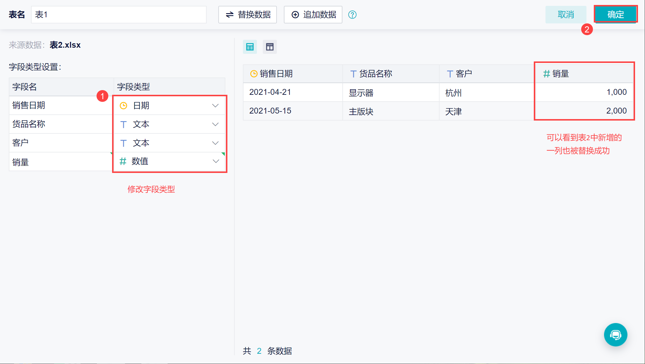 2)字段类型设置可以调整上传的数据格式。点击右上角的「确定」按钮,完成 Excel 替换。