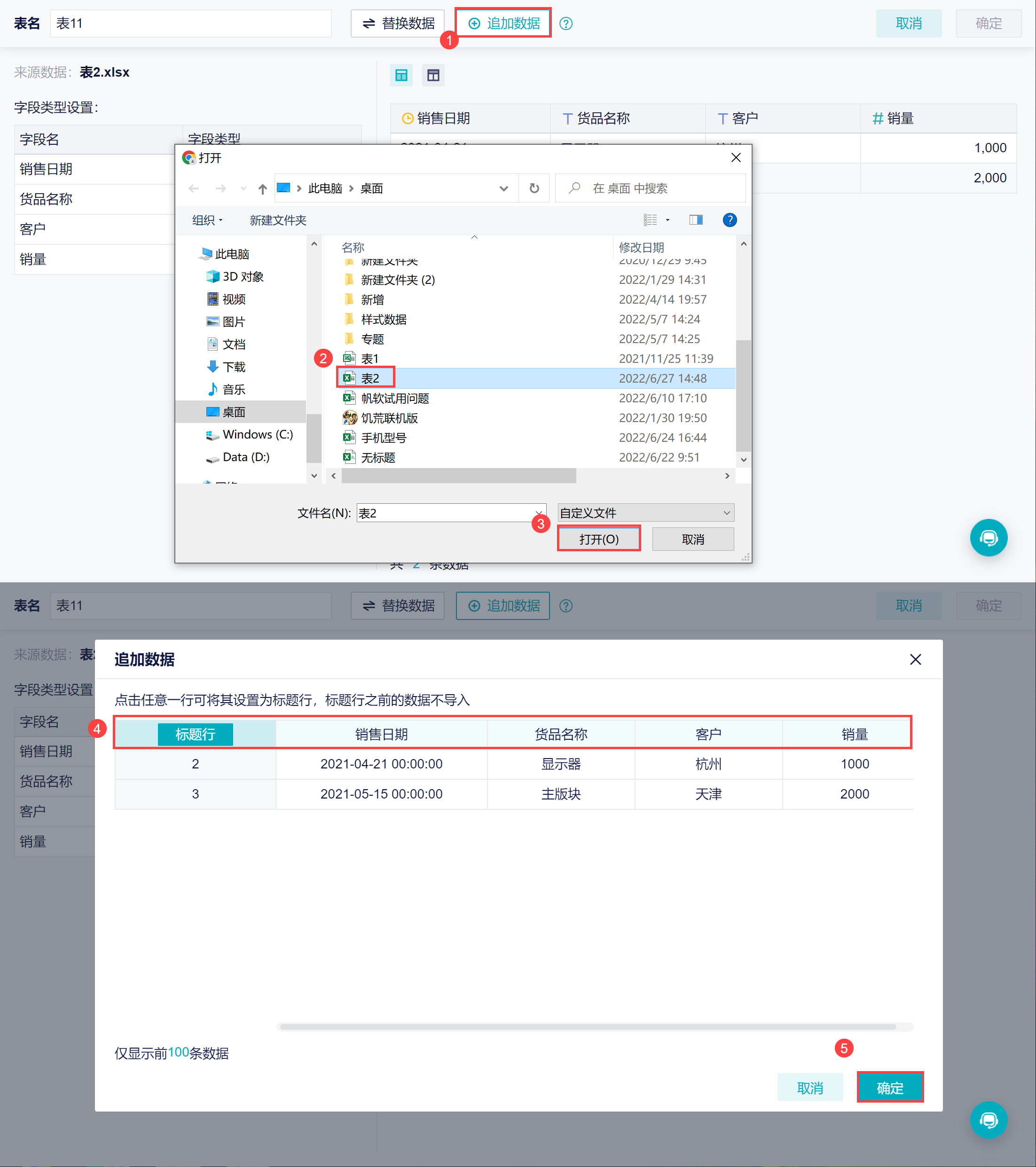 1)点击「追加数据」,上传表后,设置「标题行」,点击「确定」。