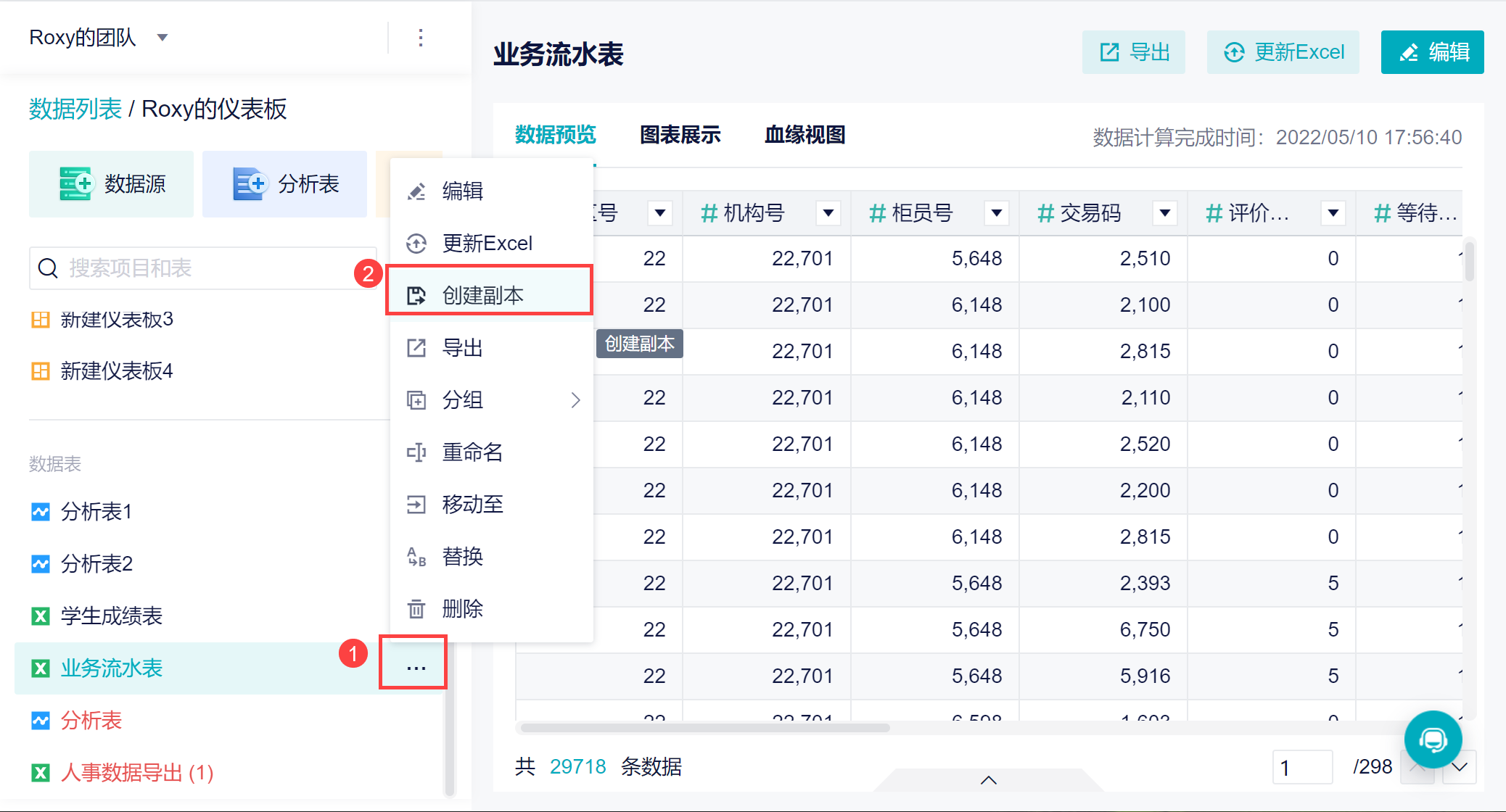 选中基础表点击「创建分析表」按钮,可直接为该表新建一张分析表,然后对表中数据进行分析。