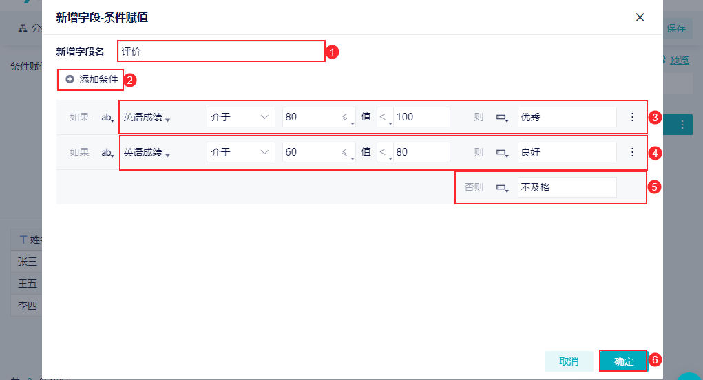4)给这个新增的字段起名为评价,并设置条件将成绩划分为三个类别,操作如下图所示: