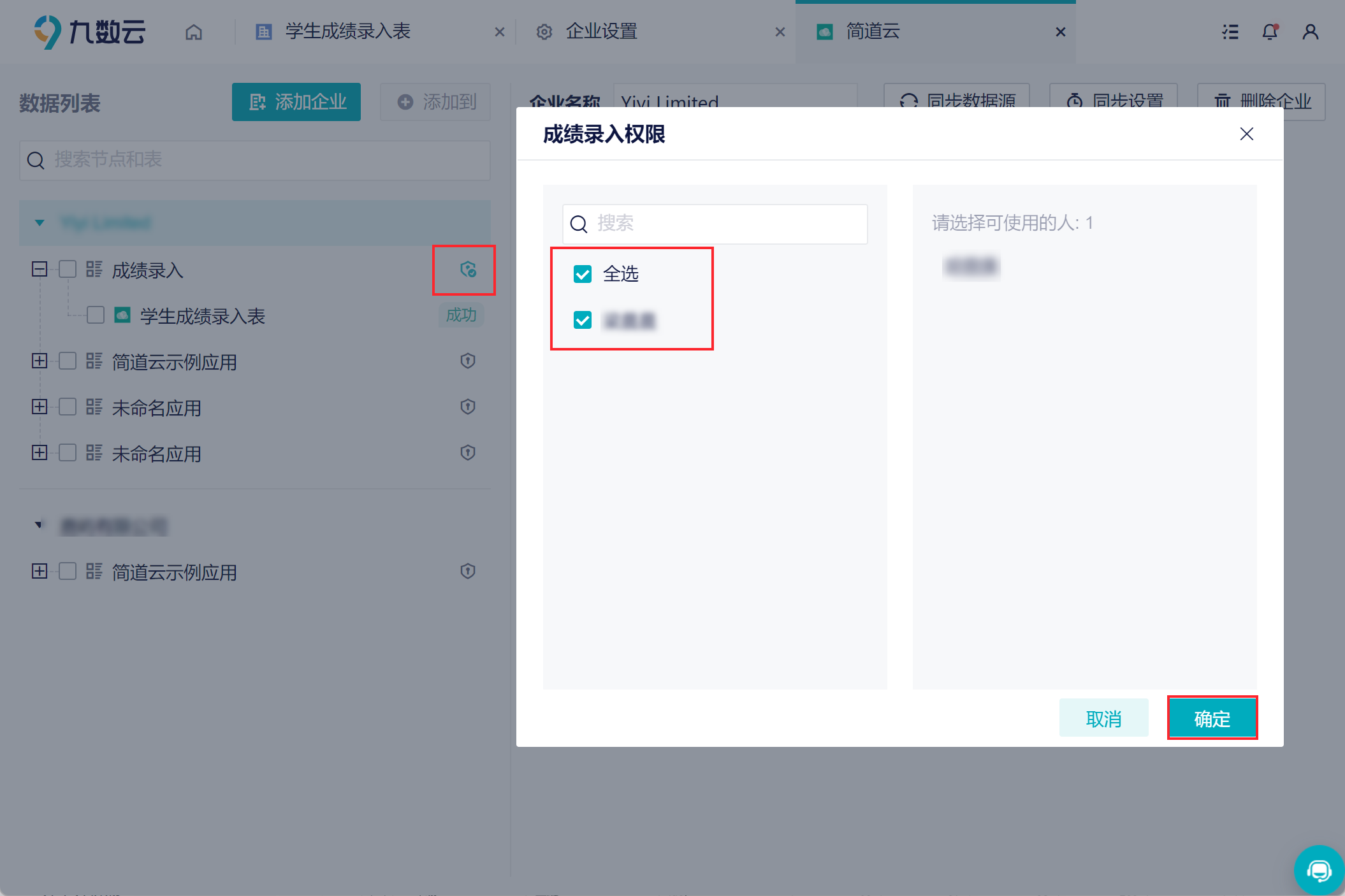 可以设置数据回填的前提是有该节点的权限,在企业数据简道云数据源的管理界面,管理员需要对成绩录入这个节点设置权限,如下图所示: