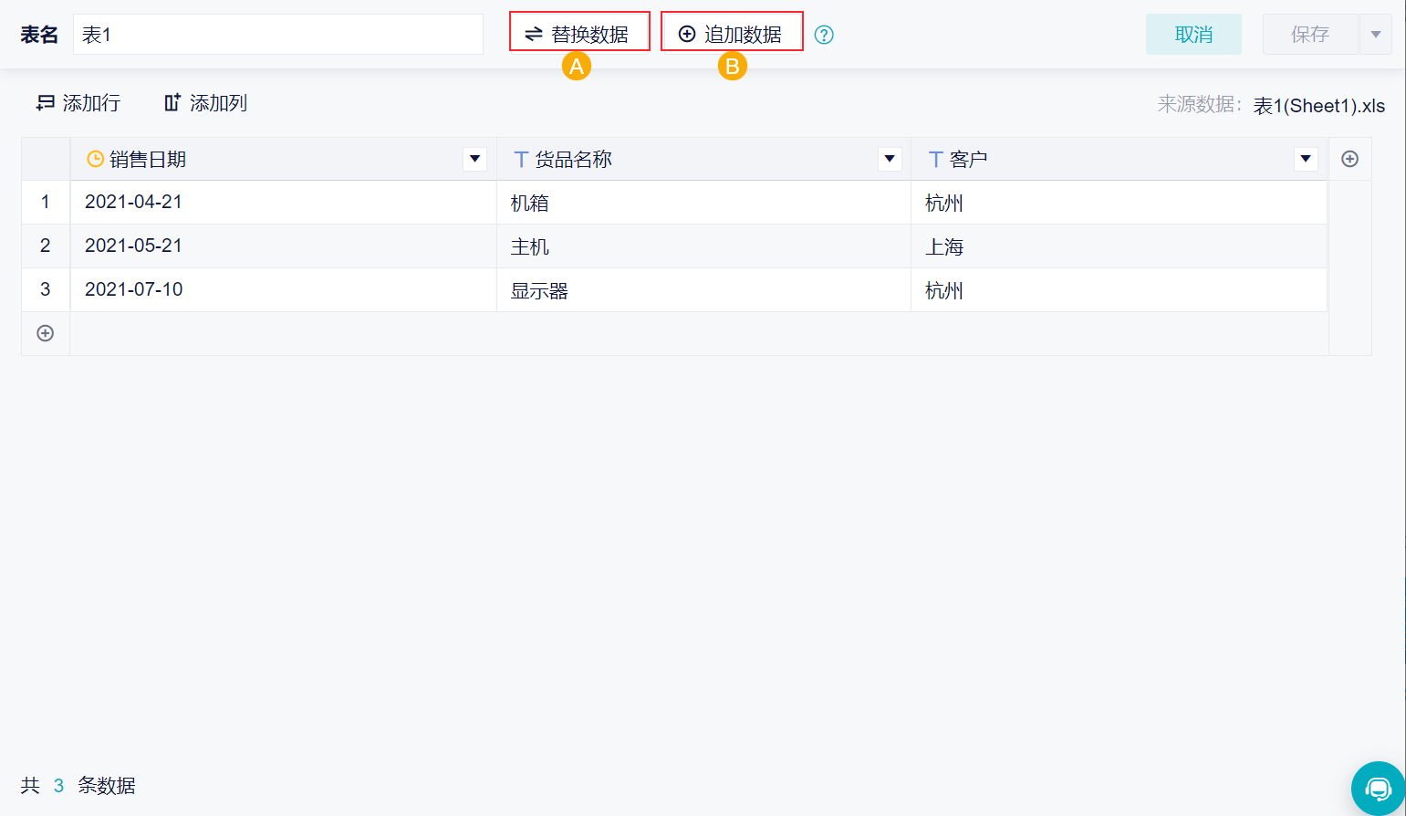 如果需要更新原有的 Excel 表,九数云提供数据表替换、追加的功能,满足用户的多种需求。