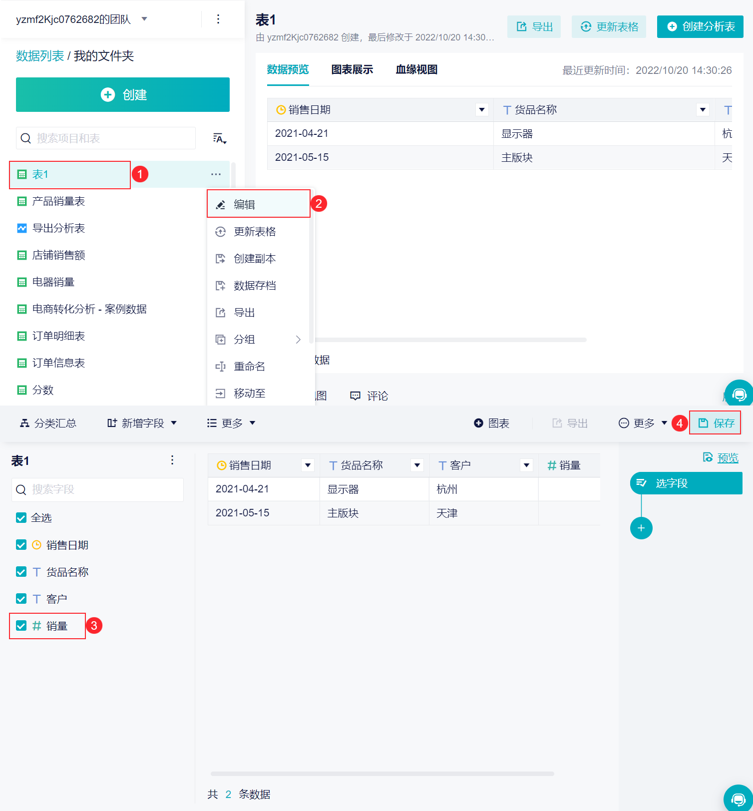 进入表编辑界面,勾选新增的销量字段,点击保存: