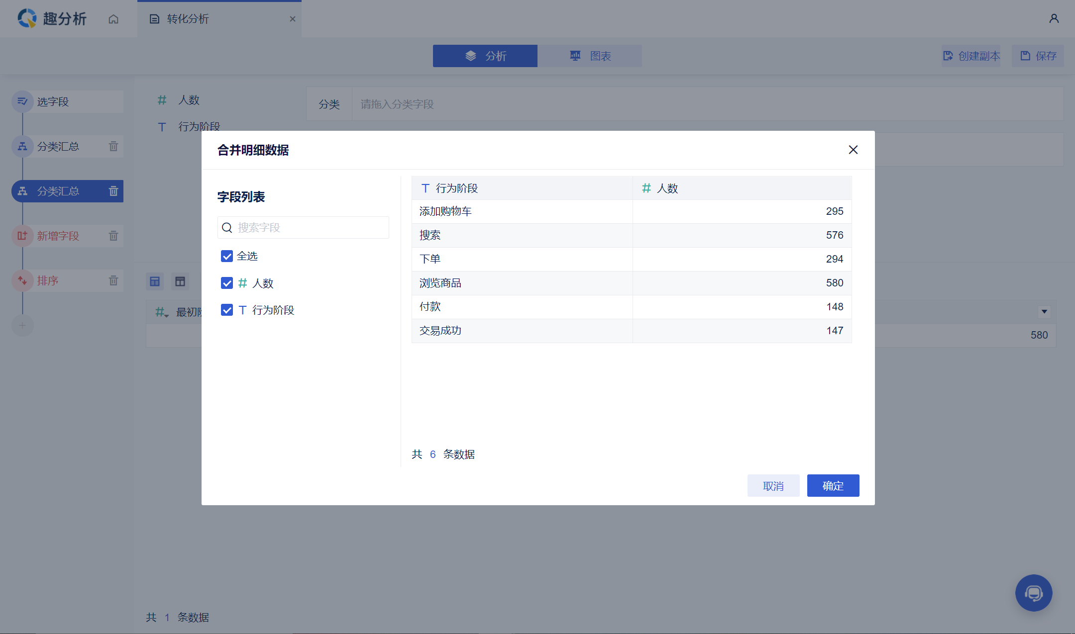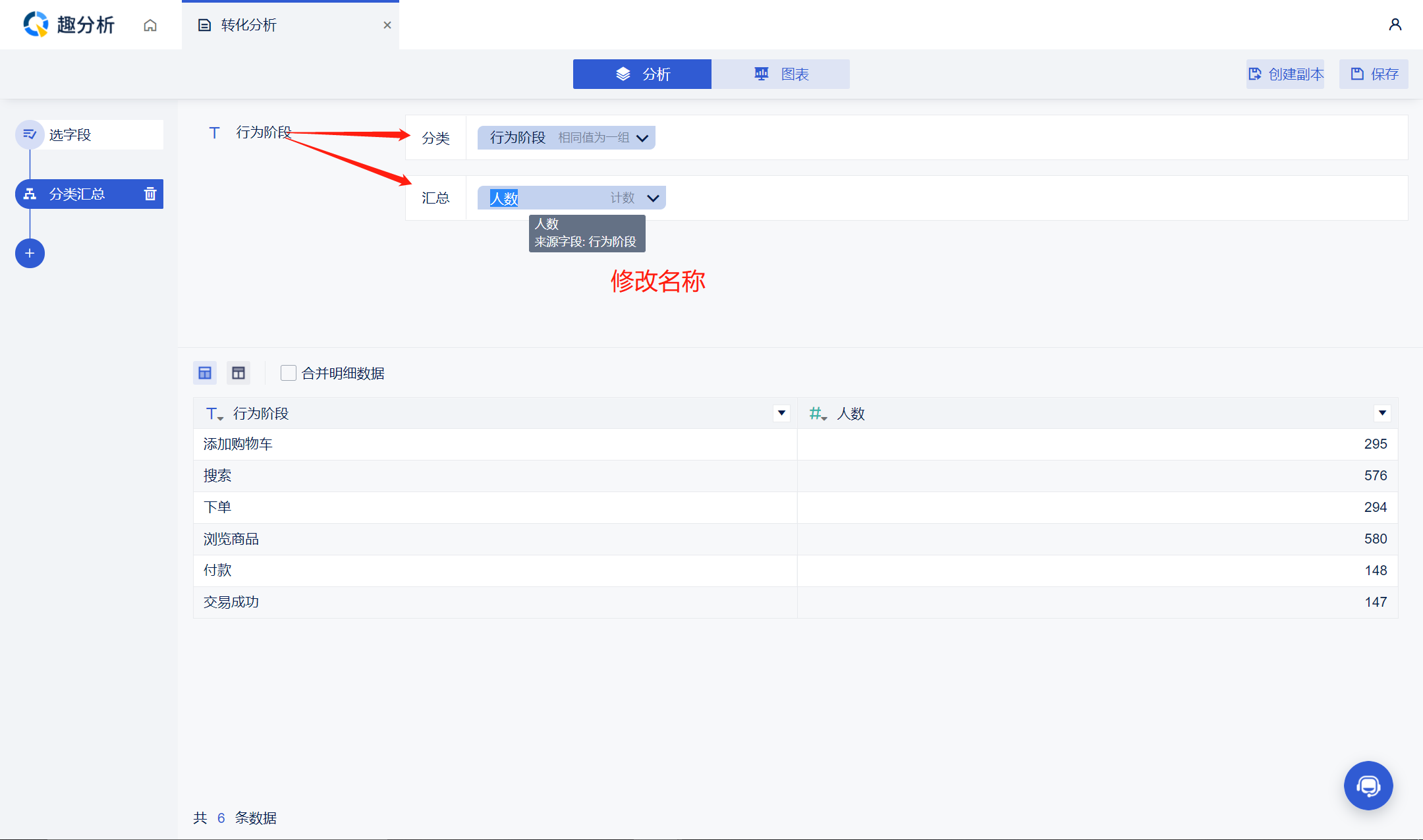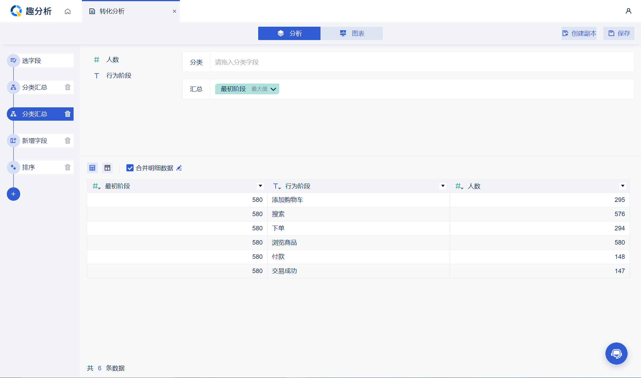 点击加号,选择分类汇总,将行为阶段分别拖入分组和汇总栏,汇总栏选择「记录个数」,如下图所示: