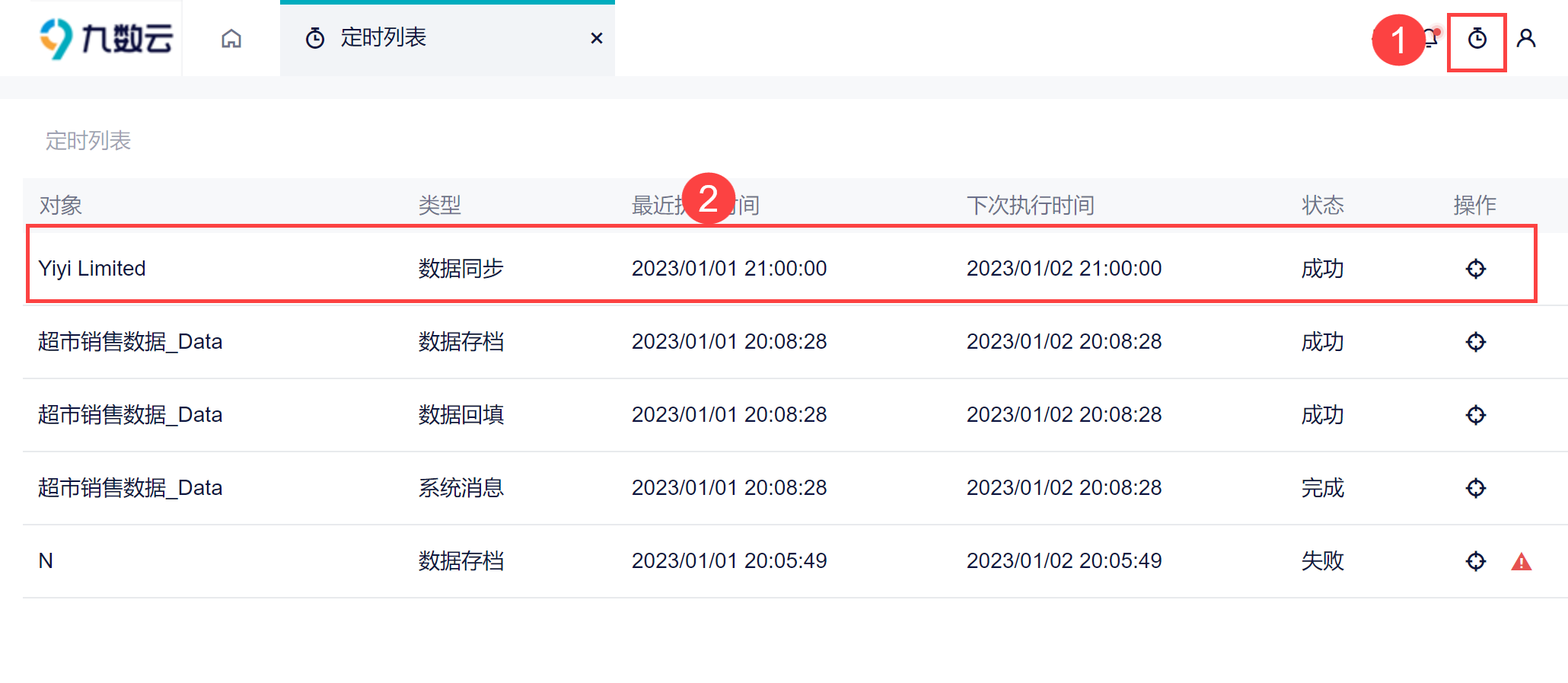如果在数据源中设置了定时同步,在数据列表中可以看到同步执行的相关情况,比如最近执行时间、下次执行时间、执行状态等等。