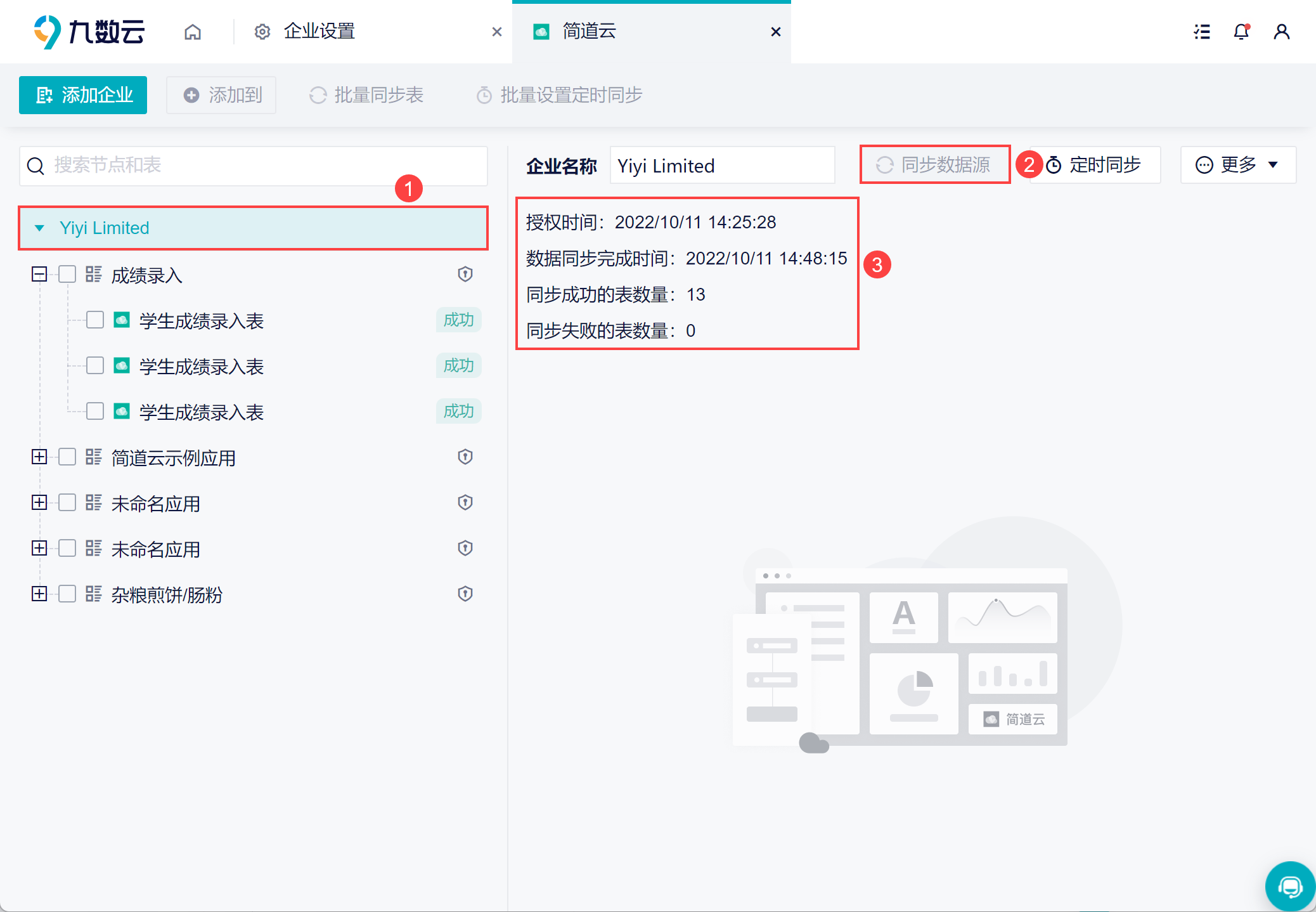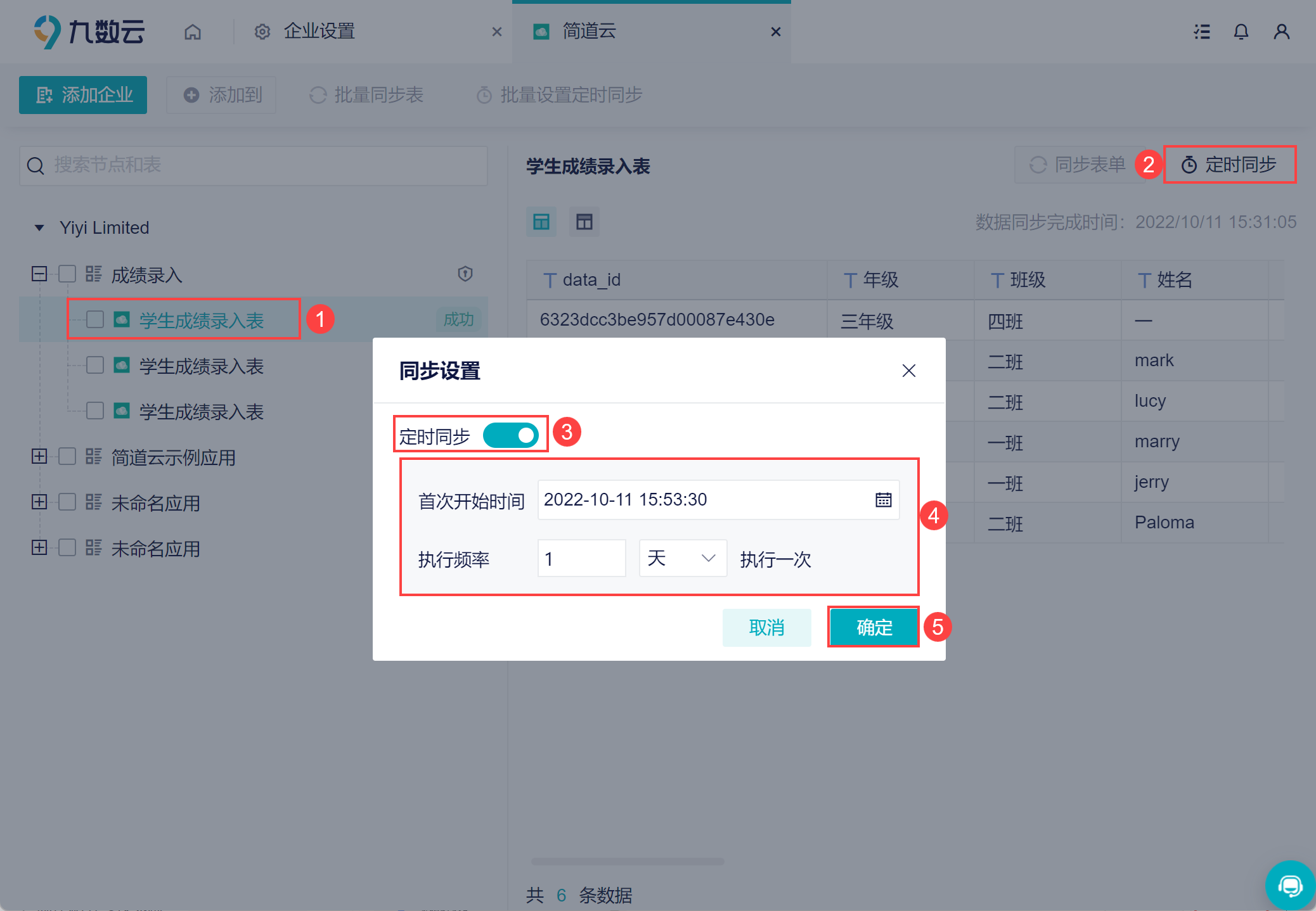 若是想要达到九数云中添加的简道云数据同步的话,可以手动点击同步,也可以进行设置定时同步。