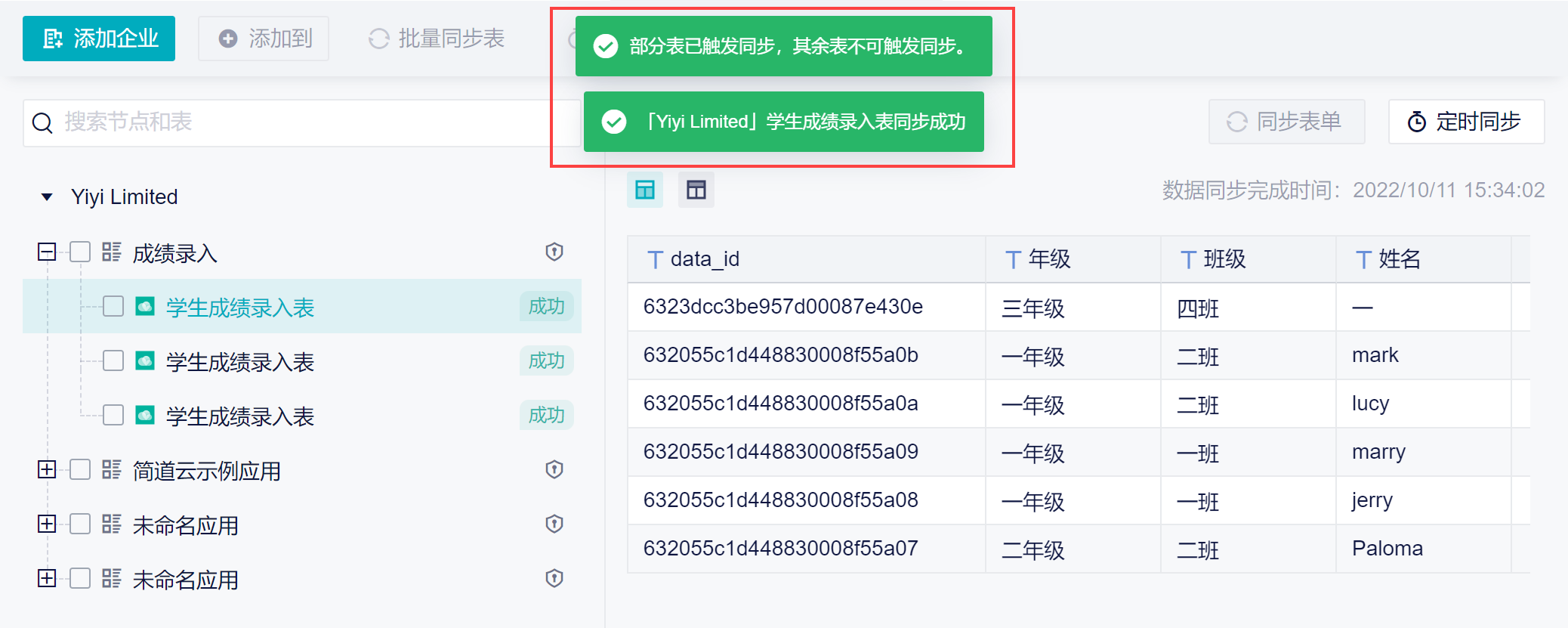 选择需要同步更新的企业,点击「同步数据源」,完成后,会显示数据同步的信息,如下图所示: