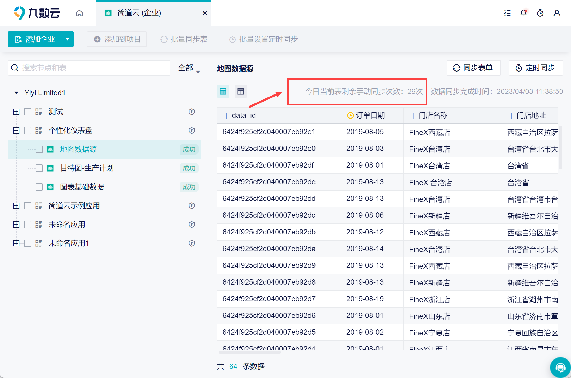 每张数据表会显示当前表剩余手动同步次数,如果次数使用完了,当天就不能再进行手动同步了。